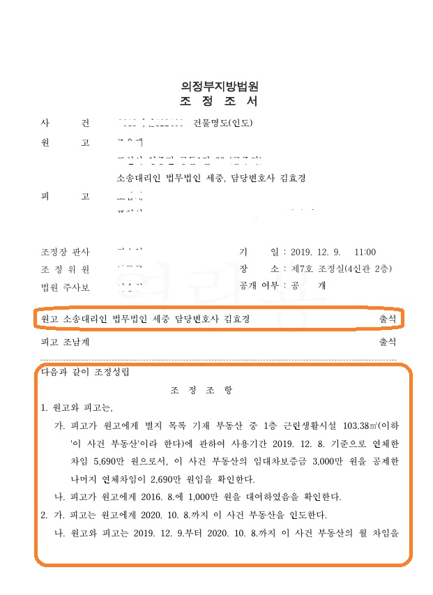 명도소송 임의조정 성립 페이지 정보 작성자 (14.♡.133.23) 작성일20-04-29 17:18 조회1,891회 댓글0건 관련링크 이전글 다음글 목록 본문 상가 임차인이 월차임 3기 이상을 연체하여 계약을 해지한 후 명도소송을 제기하였음임차인과 소송 중 원만하게 합의하여 임의조정 성립함 댓글목록 등록된 댓글이 없습니다. 이전글 다음글 목록